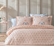 Pastel Konfor Somon renginin sıcak ve pastel tonlarıyla tasarlanan Alba Pike Takımı, %100 pamuk kumaşı ve nefes alan dokusuyla konforu garantiler. Lastikli çarşaf ve volanlı yastık kılıflarıyla kullanım kolaylığı sunar.